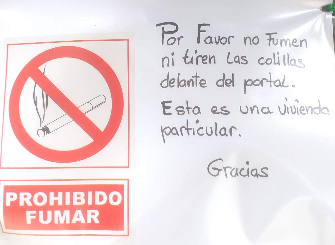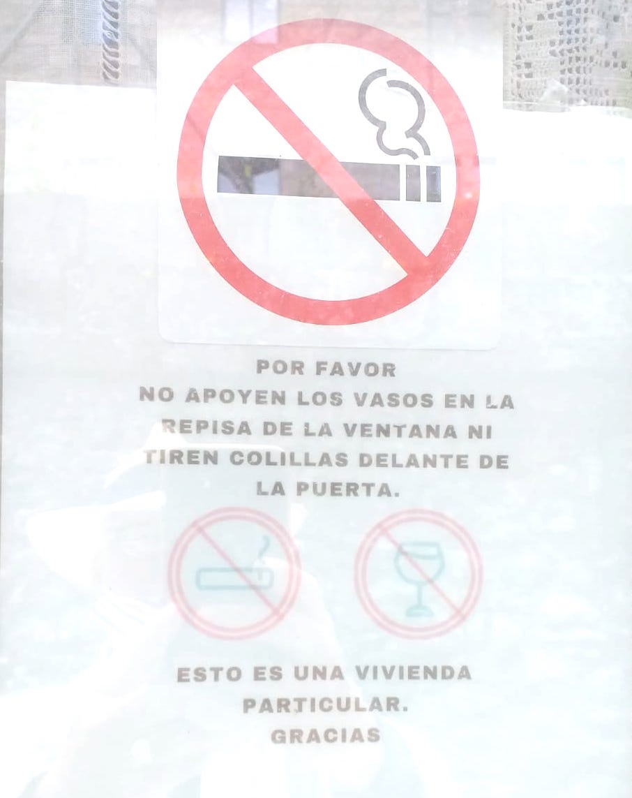 4. These signs on the windows of houses between the bars in the city’s main tapas street, imploring folk exiled from the tables not to smoke and drop butts in front of the properties:-