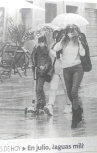 I’ve drafted a book about my first 15 months in Spain. That winter – 2000-2001 – was, my new friends insisted, the worst in 25 years. I remember it – and my 5 broken umbrellas – very well indeed. But I’d quite forgotten that July 2001 was ‘the wettest since records began’. The sun is shining brightly today but here’s a foto from yesterday’s local paper that speaks for itself about the rain of the previous few days:-