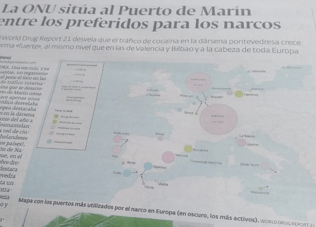 An interesting map from a local paper, in an article informing us of the growing importance of the Pontevedra port of Marín to the world’s drug barons:-