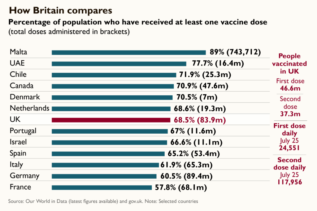 Latest Office for National Statistics figures suggest that nearly 92% of adults now carry antibodies to coronavirus, representing about 73% of the population as a whole. Some say herd immunity has been reached but others say it hasn’t for important variants. Who knows? University College London, for one, estimates total population immunity is now at 87%, although they believe the delta variant has shifted the herd immunity threshold to 93%.