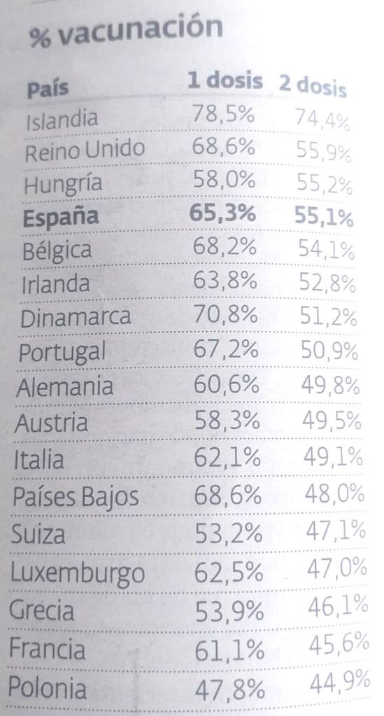 On the issue of vaccination . . . Given the importance of the tourism industry, it’s hardly surprising that Spain has put immense effort into this. Facing this challenge, it’s benefitted from having fewer anti-vaxers than in, say, next-door France, and from a round-the-clock campaign. These 2 charts show Spain’s excellent performance relative to other countries, and the PM yesterday claimed that Spain – with 400,000 shots a day – has moved up the rankings, giving it ‘the gold medal in vaccinations’, with 66.6% of the population having had one jab and 56.3% having had 2. But Chile(63%) and Canada(57.4%) would surely dispute this, at least for a few days. But no one Spanish believes what our politicians say anyway . . .