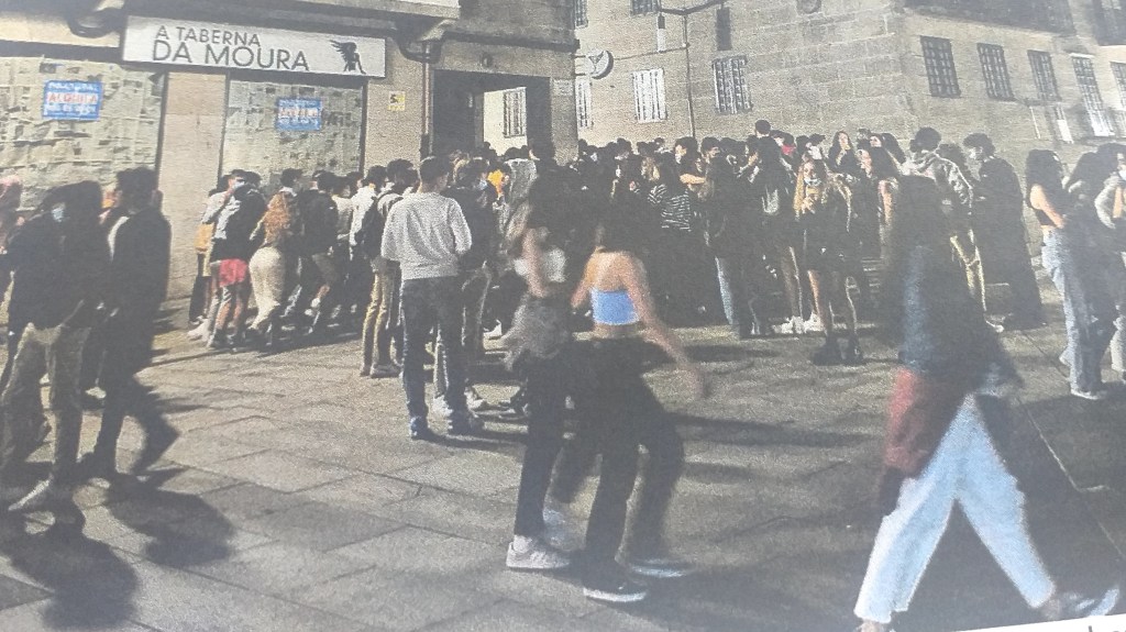 Life in Pontevedra city certainly seems to be back to normal. I can vouch for the fact the law against smoking at terrace tables is now being honoured more in the breach than the observance, and the papers this morning are full of articles on the return of illegal botellón (street/binge drinking) in the old quarter. This foto was taken in a street normally – according to a bar owner there – popular with those 30+. Not by kids of 12 upwards taking his terrace chairs ‘to make themselves comfortable’. Or to stop themselves falling over.