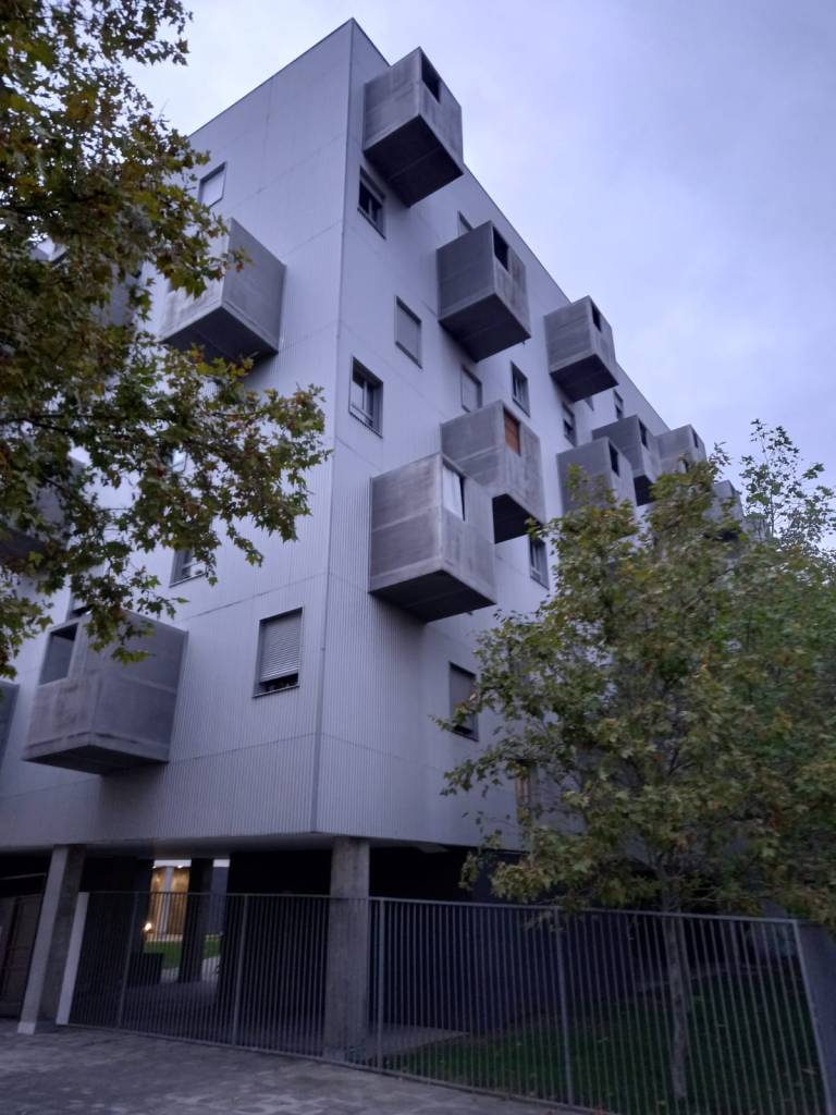 My daughter has moved to her partner’s new flat in a southern barrio of Madrid. Once a working class area, it’s now a middle-class ’dormitory’ district replete with new flat blocks. Some of these have clearly been designed by architects competing in a Most Ugly Building competition. This is the front-runner at the moment:-