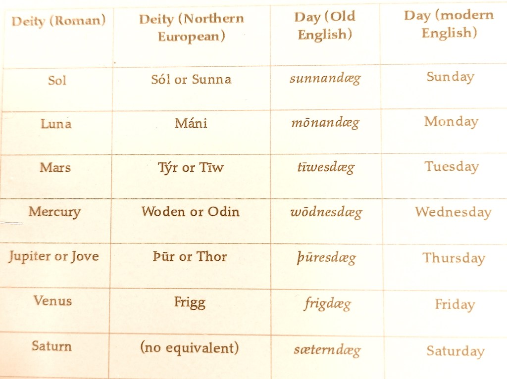 You can easily see the origin of Spanish day names from the left hand column. Except domingo. And maybe sábado. Theories welcome.
