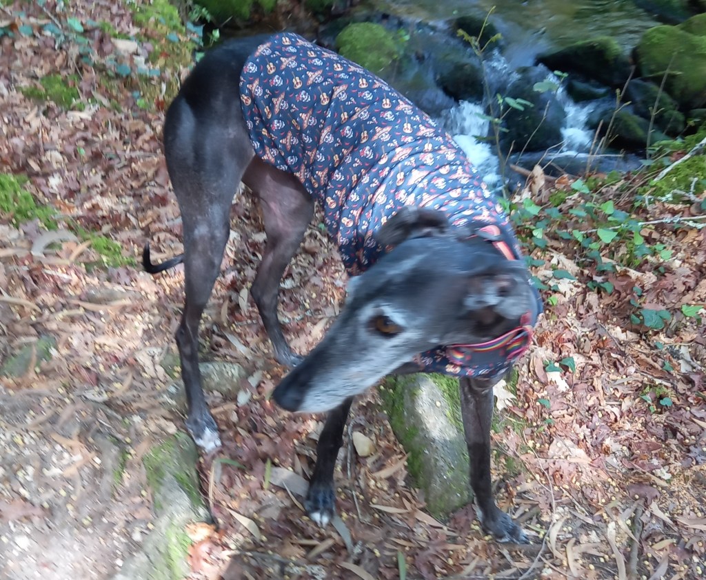 This is a Spanish greyhound – un galgo – wearing a coat on a very warm spring day.