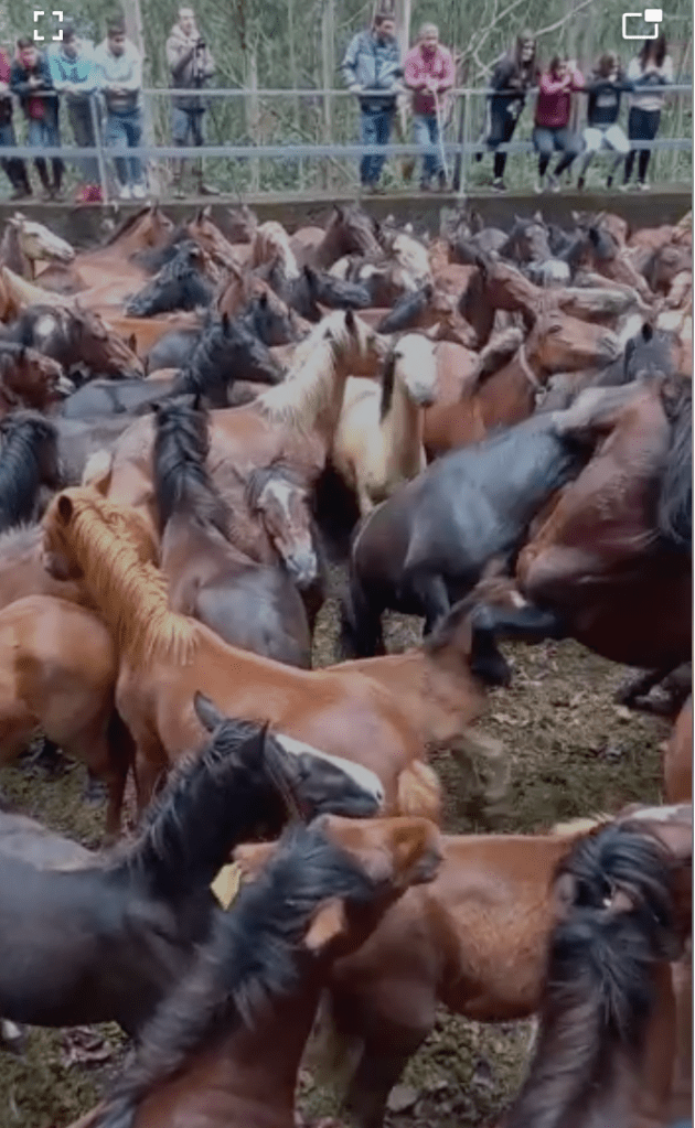 Yesterday, I took 3 English visitor to a Rapa das Bestas in the Galician hills, at Murgodans near Gondomar. This involves the rounding-up of wild horse and then the cutting of their manes and tails. As ever, quite spectacular – if a little rough on the horses, who are either wrestled to ground, if young, or lassoed with a clever snare over their heads, if adult-.-