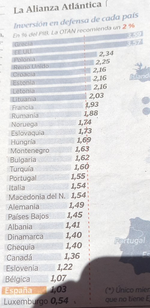 It’s notable that Spain, despite being for many years the biggest beneficiary of Brussels’ largesse, spends only 1.03%, against the NATO ‘commitment’ of at least 2%. In contrast, the current major beneficiary of Northern European taxpayers’ money – Poland – spends 2.34%. Possibly because it’s a lot closer to Russia.