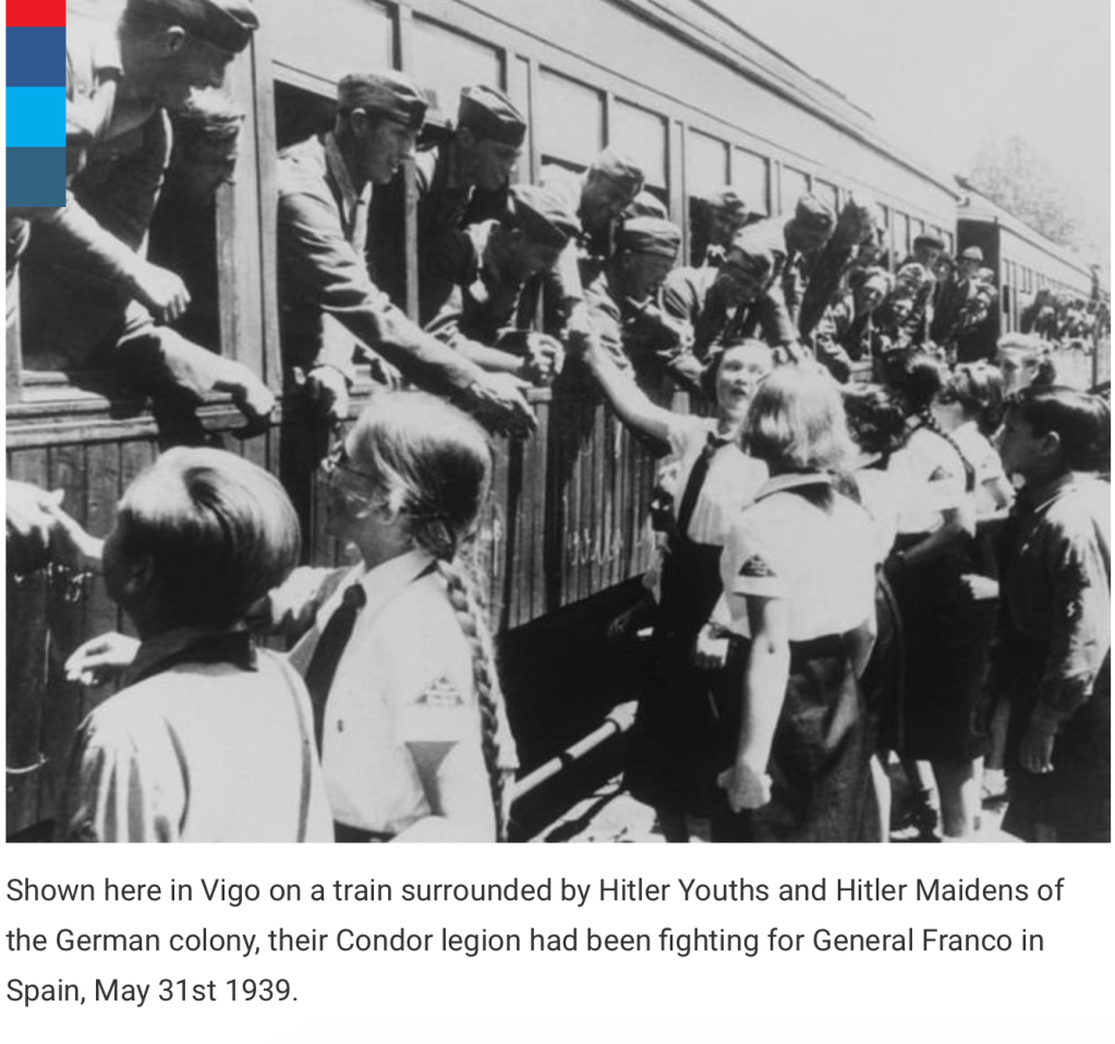 This is one of the Civil War fotos, showing German Condor troops being seen off at Vigo station in 1939:-