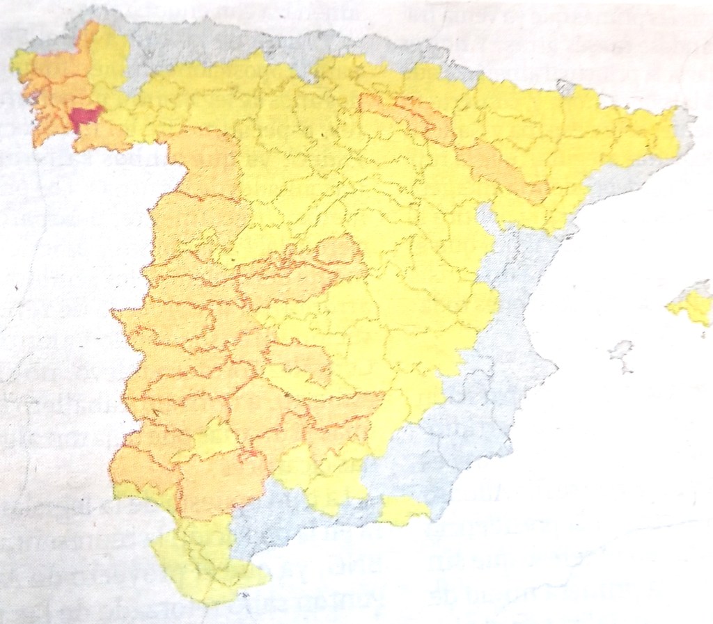 The dial hit 38 degrees in Pv city yesterday, and it was 27 in my salón at 7 this morning, against ‘only’ 24 outside. Up in Ourense it was even worse, at 42 or more. As this map shows, it’s the only place in the whole of Spain on red alert this week:-