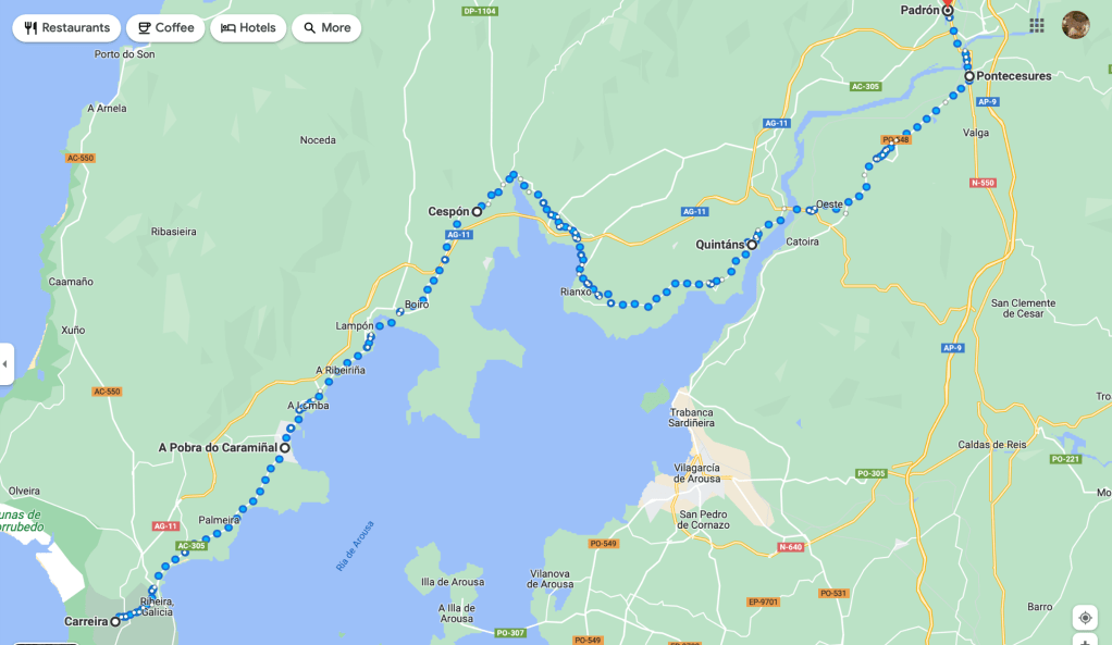 O Grove to Padrón via Pontecesures, assuming you don’t take boat from Cambados. This is the last bit of the ‘Coastal Camino’ from Pv city, via Combarro and Sanxenxo.