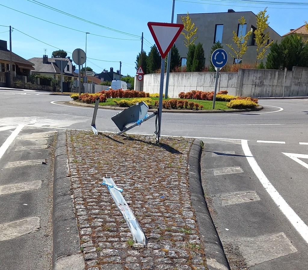 This is/was a sign at a roundabout at the bottom of my hill. It looks to have been hit by someone coming from Pv city and turning left rather too fast:-