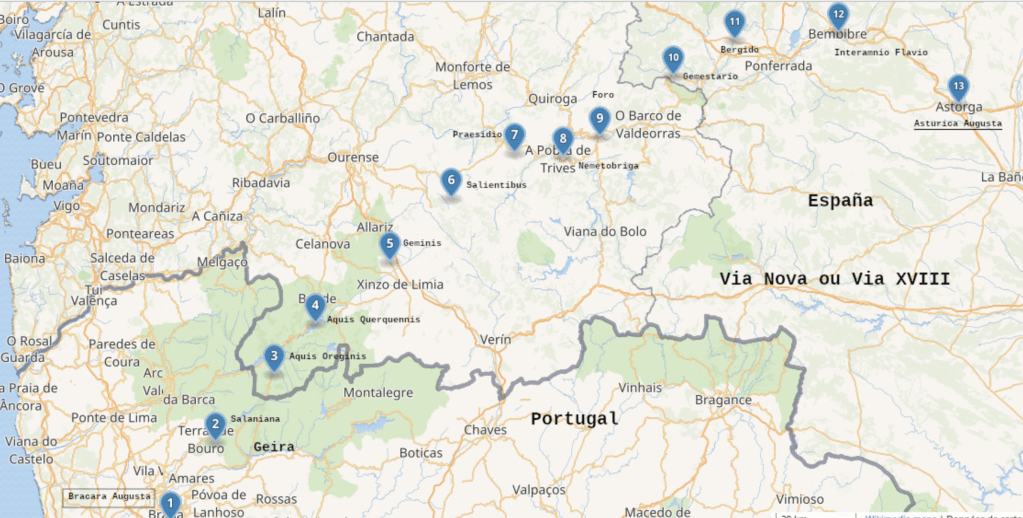 Via XIX: This passed through Pv city and forms part of the Portuguese camino. This is the full route, with both Roman and modern town names: Bracara Augusta (Braga), Ponte de Lima, Tude (Tuy), Turoqua (Pontevedra), Aquis Celenis (Caldas de Reyes), Iria, Martiae, Lucus Augusti (Lugo) and Asturica Augusta (Astorga).