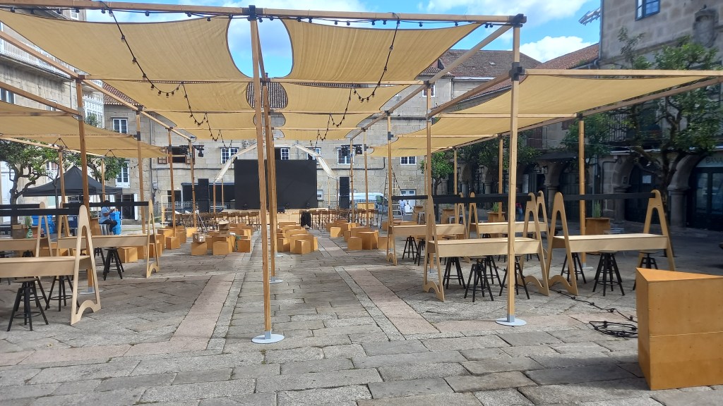 This turned out to be part of a large gathering of representatives from 45 countries, here to discuss ‘the future of the city’. It’s apparently called La Placemaking Week, whatever TF that means. And an ad in today’s Diario de Pontevedra talks of a session in the square entitled Play the Place. Another one is entitled: Permission to Play in Public Spaces(Play-ce Making).I kid you not. I’m beginning to suspect the global attention give to our mayor has gone to his head. But no doubt it’ll bring a lot of other countries’ taxpayers’ money to Pv.