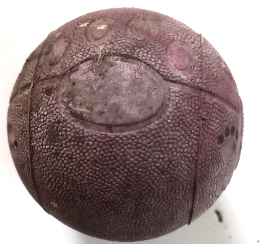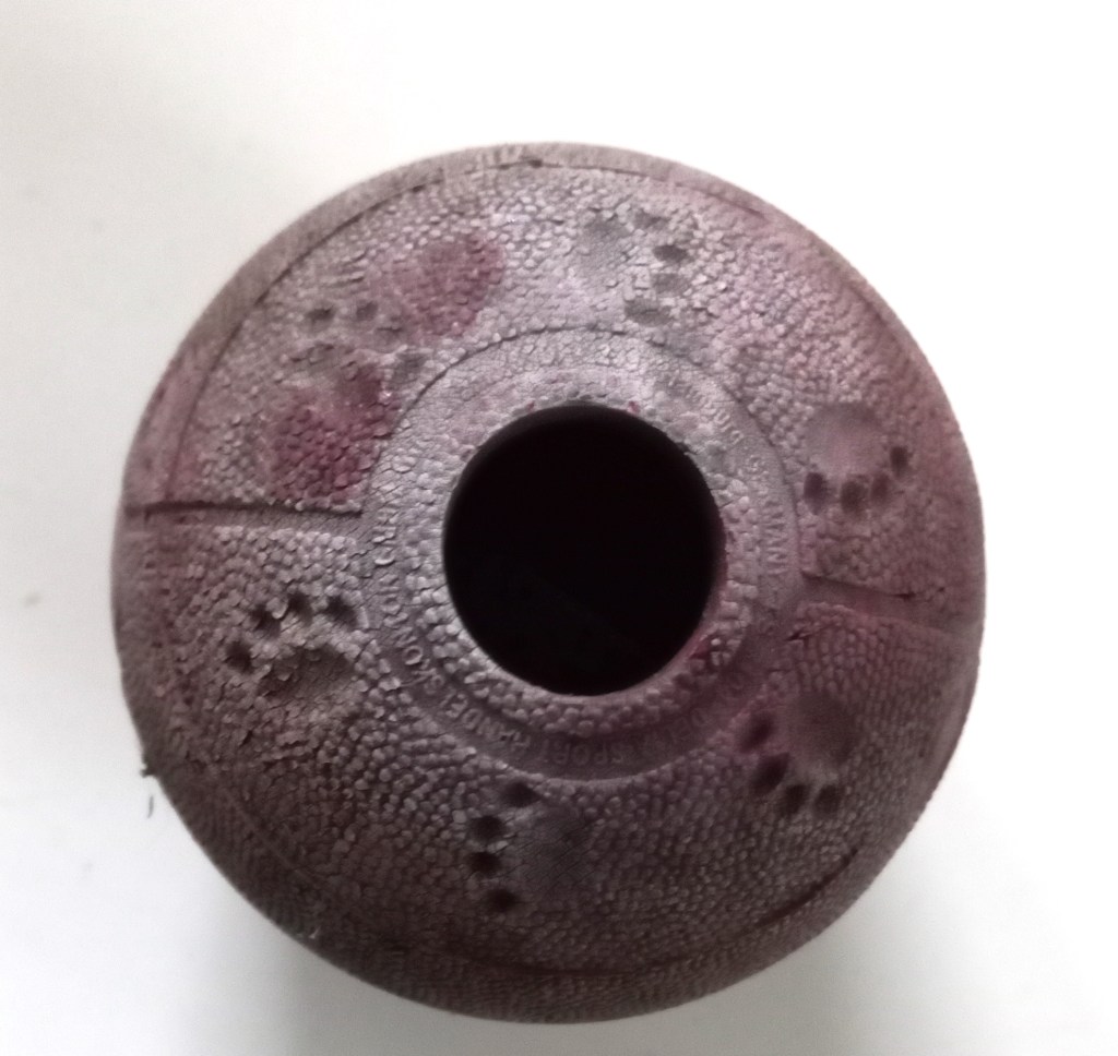 As I drove down the steep hill from my house yesterday, the corner of my left eye noted something small and dark undertaking me at the side of the road. My first thought was that it was a very speedy rat – though at 30km+ seemed unlikely. So, I wasn’t surprised to see it was a rubber ball. After a few seconds, it crossed in front to me and came to rest behind the wheel of a parked car. This is it, possibly without something that used to be inside it:-