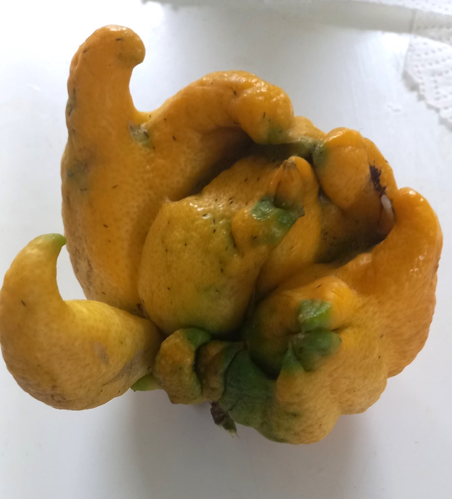 To amuse . . A couple of years or so ago, my lemon tree almost died as a result of an aphid infestation. But I managed to get rid of the little buggers by spraying the tree with a mixture of washing-up liquid and olive oil, and the tree revived, giving me 30+ lemons this autumn. Picking some for my neighbours last night, I noticed this one:-