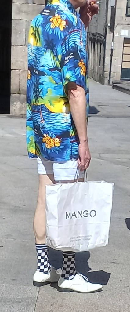 The wonderful weather has brought crowds of tourists to Pv city, including this gaily-dressed* one, taking a cigarette break after a bit of shopping. Check out the socks . . .