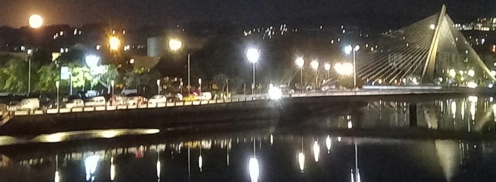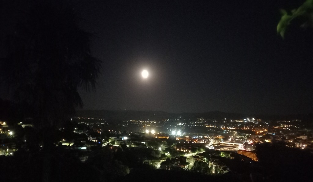 Last night’s supermoon, which was a lot more orange than it appears here, over the city from O Burgo bridge and from my eyrie:-