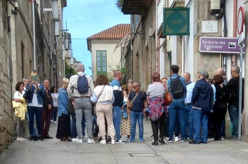 - I’ve mentioned the ever-larger groups of tourists being given a tour of Pv city’s old quarter, most of whom seem to give no thought to the possibility that they’re blocking the street where they pause awhile. To listen or chat. Here’s one such group – of c. 25-30 – being told about Sor Lúcia of Fátima fame, who came to live (and die) in a little convent in Pv city, where she had Jesus and the Virgin Mary come and talk to her. For the 2nd time in Mary’s case.