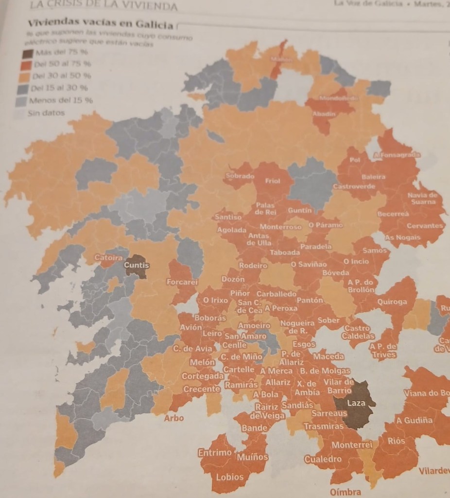 Per the VdG: Galicia es la comunidad con más viviendas vacías de España, con casi 33%, frente al 14% de la media española. Hay municipios, como Cuntis, donde el 75 % están desocupadas. Entre las ciudades, destacan Vigo y A Coruña, que ocupan la segunda y y la tercera plaza del ránking español de ciudades de más de 200.000 habitantes con un mayor porcentaje de pisos vacíos. Solo las superaba, tras la pandemia, Santa Cruz de Tenerife. Y hay un dato alarmante: el año pasado, seis de cada diez compras de vivienda se pagaron al contado, lo que indica que van a parar a rentas altas, extranjeros o fondos de inversión. The excess above the national average is large enough to raise the question of what the specific Galician factors are. Answers on a postcard please.