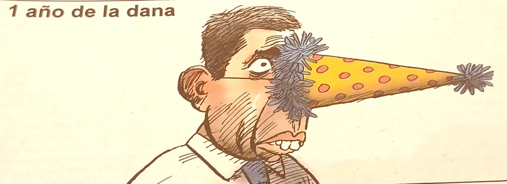 We’re coming up to the sad anniversary of the appalling floods in Valencia. The BBC has an article here and The Guardian here. The VdG had this cartoon today of the regional president Sr Mazón, who’s being kept in his job by the 2 right-wing parties, PP and Vox.