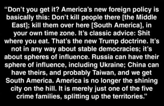 Projection, projection, projection . . . Trump says one of the justifications for removing Maduro is that he refused to honour the results of a democratic election. Another is that he was corrupt, etc. , etc.