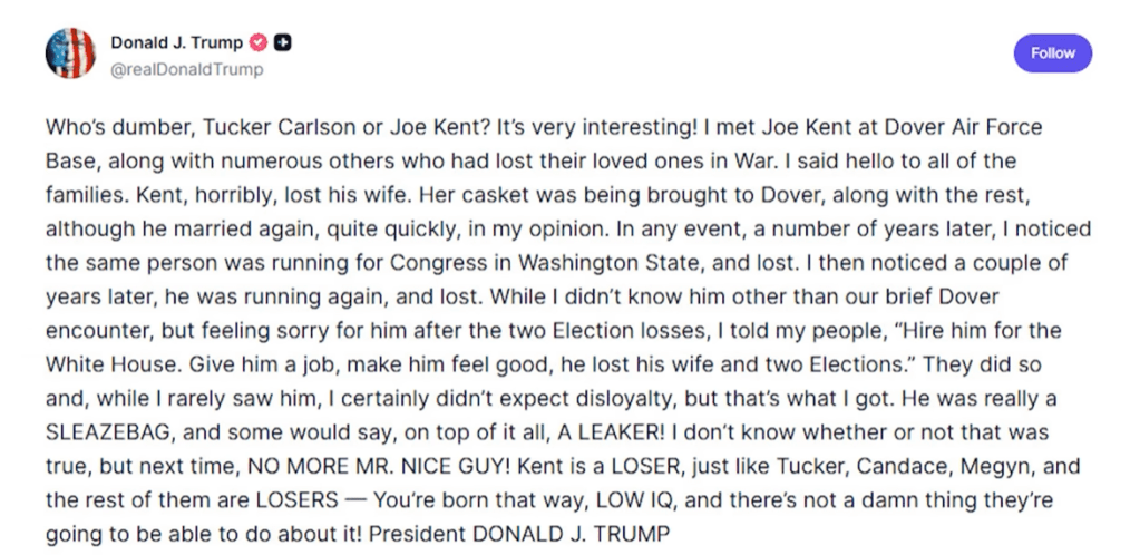 - Gutter-level insults hatred towards his ex-friends.